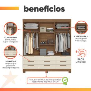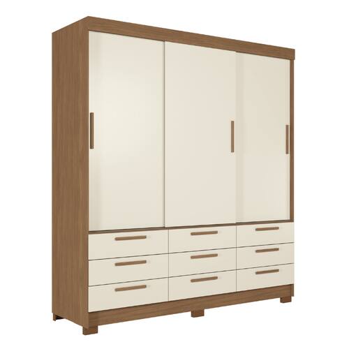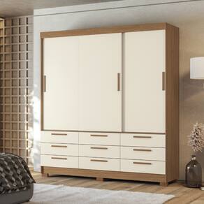 O guarda roupas Uraí tem um design moderno e funcional, com 3 portas de correr e puxadores em MDF revestido, proporcionam praticidade e um visual sofisticado. Seus pés em PVC garantem estabilidade e proteção contra o contato direto com o chão. Conta com 9 gavetas externas equipadas com corrediças telescópicas para um bom deslizamento, 2 cabideiros para melhor organização de seu espaço, espaço para calçados, e amplas prateleiras para organização de acessórios e outros itens. Além disso, um amplo maleiro para armazenar objetos maiores. O sistema de portas de correr utiliza trilho metálico, garantindo maior durabilidade e eficiência no uso diário. Este guarda roupas combina praticidade, espaço e um design elegante, ideal para quem busca otimizar o ambiente e o uso no dia a dia.