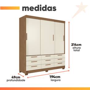MEDIDAS: [ A ] = 214 cm [ L ] = 194 cm [ P ] = 49 cm PESO: 114,9 kg PESO SUPORTADO: 93 kg GAVETAS SUPORTAM ATÉ: 3 kg PRATELEIRAS SUPORTAM ATÉ: 8 kg CABIDEIROS SUPORTAM ATÉ: 5 kg MODELO: Guarda Roupas Casal 3 Portas 9 Gavetas Uraí MARCA: Santos Andirá ACABAMENTO: Fosco TIPO DE PINTURA: Fosco MATERIAL: MDP (12mm) PORTAS: 3 TIPO DE PORTA: Correr MATERIAL DOS PUXADORES: MDF CORREDIÇAS: Telescópicas Metálica GAVETAS: 9 PRATELEIRAS: 4 CABIDEIROS: 2 MATERIAL DOS CABIDEIROS: Alumínio PÉS: 6 MATERIAL DOS PÉS: PVC INSTRUÇÕES E CUIDADOS: Utilizar panos secos ou levemente umedecidos, não utilizar produtos abrasivos ou químicos. DIFERENCIAL: Portas de correr, puxadores em MDF revestidos, pés em PVC, gavetas externas com corrediças telescópicas. SISTEMA DE MONTAGEM: Parafusos, Cavilha, Minifix GARANTIA: 3 Meses.