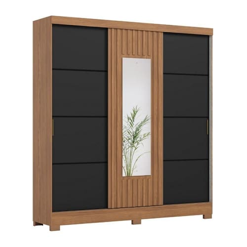 Guarda Roupas Casal 3 Portas De Correr Com Espelho Ripado 2 Gavetas Lotus Madeirado / Preto