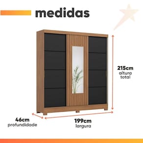 Importante sobre a entrega: A entrega é realizada até a portaria ou porta de entrada do endereço indicado, desde que o acesso seja permitido. Para locais com portaria, a entrega será feita no piso térreo. Não realizamos montagem, desmontagem, transporte por escadas ou içamento. É responsabilidade do cliente verificar se as dimensões do produto são compatíveis com portas, elevadores e corredores. Evite imprevistos: confira todos os detalhes antes de concluir sua compra. MEDIDAS:: A = 215 cm L = 199 cm P = 46 cm | MEDIDAS DO ESPELHO:: A = 125 cm L = 35 cm | MEDIDAS DOS PÉS:: A = 6 cm L = 10 cm P = 4 cm | PRATELEIRAS SUPORTAM ATÉ:: 8 kg | GAVETAS SUPORTAM ATÉ:: 3 kg | CABIDEIROS SUPORTAM ATÉ:: 8 kg | PESO:: 224 kg | MODELO:: Guarda Roupas Casal 3 Portas de Correr com Espelho Ripado 2 Gavetas Lotus | MARCA:: Henn | MATERIAL:: MDP | ESPESSURA DO MATERIAL DA ESTRUTURA:: 15 mm | TIPO DE PORTA:: Correr, maior praticidade no dia a dia | PORTAS:: 3 | DOBRADIÇAS:: Metálicas | GAVETAS:: 2 | CORREDIÇAS:: Telescópicas, abertura suave | PRATELEIRAS:: 3 | CABIDEIROS:: 3 | MATERIAL DO CABIDEIRO:: Madeira | ESPELHO:: Sim | PUXADORES:: 2 unidades, em ABS | PÉS:: 6 unidades, em ABS | DIFERENCIAL:: Corrediças telescópicas e um amplo espelho central | ITENS INCLUSOS:: 1 Guarda Roupa, 1 Manual de montagem, 1 Kit Parafusos. | SISTEMA DE MONTAGEM:: Parafusos e Cavilhas | INSTRUÇÕES E CUIDADOS:: Para limpeza de seu móvel, use uma flanela limpa e seca. Não utilize produtos químicos que possam danificar o produto. | GARANTIA:: 3 Meses | AVISO:: Importante sobre a entrega: A entrega é realizada até a portaria ou porta de entrada do endereço indicado, desde que o acesso seja permitido. Para locais com portaria, a entrega será feita no piso térreo. | Altura: 215 | Largura: 199 | Profundidade: 46 | Requer montagem: Sim | Inclui manual de montagem: Sim | Materiais da estrutura: MDP | Cor: Madeirado / Preto