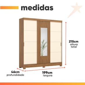 MEDIDAS: A = 215 cm L = 199 cm P = 46 cm MEDIDAS DO ESPELHO: A = 125 cm L = 35 cm MEDIDAS DOS PÉS: A = 6 cm L = 10 cm P = 4 cm PRATELEIRAS SUPORTAM ATÉ: 8 kg GAVETAS SUPORTAM ATÉ: 3 kg CABIDEIROS SUPORTAM ATÉ: 8 kg PESO: 224 kg MODELO: Guarda Roupas Casal 3 Portas de Correr com Espelho Ripado 2 Gavetas Lotus MARCA: Henn MATERIAL: MDP ESPESSURA DO MATERIAL DA ESTRUTURA: 15 mm TIPO DE PORTA: Correr, maior praticidade no dia a dia PORTAS: 3 DOBRADIÇAS: Metálicas GAVETAS: 2 CORREDIÇAS: Telescópicas, abertura suave PRATELEIRAS: 3 CABIDEIROS: 3 MATERIAL DO CABIDEIRO: Madeira ESPELHO: Sim PUXADORES: 2 unidades, em ABS PÉS: 6 unidades, em ABS DIFERENCIAL: Corrediças telescópicas e um amplo espelho central ITENS INCLUSOS: 1 Guarda Roupa, 1 Manual de montagem, 1 Kit Parafusos. SISTEMA DE MONTAGEM: Parafusos e Cavilhas INSTRUÇÕES E CUIDADOS: Para limpeza de seu móvel, use uma flanela limpa e seca. Não utilize produtos químicos que possam danificar o produto. GARANTIA: 3 Meses