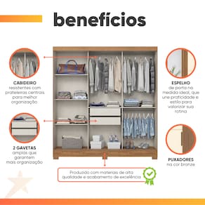 O Guarda Roupa Casal Lotus com espelho ripado é a escolha perfeita para quem busca sofisticação e praticidade no mesmo móvel. Seu design moderno conta com portas deslizantes que otimizam o espaço do ambiente, além de trazerem um toque de elegância com o detalhe ripado central e o espelho integrado, que amplia a sensação de amplitude no quarto. Internamente, oferece excelente capacidade de organização com cabideiros, ideais para manter roupas bem acomodadas, gavetas amplas com corrediças telescópicas que garantem praticidade no dia a dia e prateleiras que facilitam a organização de peças menores, acessórios e calçados. Os puxadores sofisticados completam o visual, unindo beleza, resistência e funcionalidade em um único móvel.