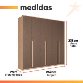 MEDIDAS: [ A ] = 238 cm [ L ] = 252 cm [ P ] = 59 cm PESO: 206,25 kg PESO SUPORTADO: 115 kg GAVETAS SUPORTAM ATÉ: 3 Kg PRATELEIRAS SUPORTAM ATÉ: 8 Kg CABIDEIRO SUPORTA ATÉ: 5 Kg MODELO: Guarda Roupas Casal 6 Portas 4 Gavetas Milano MARCA: Santos Andirá PINTURA DO GUARDA ROUPAS: Wood com acabamento em verniz fosco ACABAMENTO DAS PORTAS: Texturizado com efeito que imita couro MATERIAL: MDP (12/15/25mm) PORTAS: 6 TIPO DE PORTA: Bater (Dobradiças Snow Motion) GAVETAS: 4 PRATELEIRAS: 7 QUANTIDADE DE CABIDEIRO: 3 CABIDEIROS: Alumínio CORREDIÇAS: Telescópicas Metálicas PUXADOR: MDF DIFERENCIAL: Portas com acabamento texturizado imitando o couro, puxadores em MDF revestido, gavetas internas com corrediças telescópicas, cabideiros oblongos de alumínio, dobradiças com amortecedores. SISTEMA DE MONTAGEM: Parafusos, Cavilha, Minifix. INSTRUÇÕES E CUIDADOS: Utilizar panos secos ou levemente úmidos, não utilizar produtos químicos. GARANTIA: 3 meses pelo fabricante.