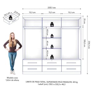 Certifique-se de tudo antes de finalizar a compra, evitando assim futuros desagrados ou imprevistos com a . MEDIDAS:: [ A ] = 230,3 cm [ L ] = 230,1 cm [ P ] = 46,3 cm | PESO SUPORTADO:: 40kg | PESO:: 150kg | GAVETAS SUPORTAM ATÉ:: 03kg | PRATELEIRAS SUPORTAM ATÉ:: 05kg | CABIDEIROS SUPORTAM ATÉ:: 08kg | MODELO:: Guarda Roupas Casal 6 Portas 6 Gavetas Maximus | MARCA:: Zanzini | MATERIAL:: MDP 12mm | PINTURA:: Texturizado | ACABAMENTO:: Fosco | PORTAS:: 06 | TIPO DE PORTA:: Bater | GAVETAS:: 06 | PRATELEIRAS:: 02 | CABIDEIROS:: 02 | MATERIAL DOS CABIDEIROS:: Metálico | PÉS:: Não possui | POSSUI SAPATAS:: Sim, sapatas plásticas | CORREDIÇAS:: Telescópicas | DOBRADIÇAS:: Metálica | PUXADORES:: 12 | MATERIAL PUXADORES:: MDF | ITENS INCLUÍDOS:: 01 Guarda Roupas, 01 manual de montagem e Kit parafusos | GARANTIA:: 03 Meses | AVISO:: A Esplanada Móveis se responsabiliza pela dos produtos adquiridos até a porta de entrada ou portaria do indicado, se a portaria do condomínio permitir, as são efetuadas no piso térreo e é de responsabilidade do cliente. | MATERIAIS DA ESTRUTURA: MDP | LARGURA: 230,1 | ALTURA: 230,3 | PROFUNDIDADE: 46,3 Cor: madeirado