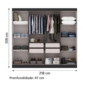 Certifique-se de tudo antes de finalizar a compra, evitando assim futuros desagrados ou imprevistos com a . MEDIDAS:: [ A ] = 200 cm [ L ] = 218 cm [ P ] = 47 cm | PESO:: 126,65 kg | PESO SUPORTADO:: 112 kg | PRATELEIRAS SUPORTAM ATÉ:: 6 kg | GAVETAS SUPORTAM ATÉ:: 3 kg | MODELO:: Guarda Roupas Casal 8 Portas 4 Gavetas | MARCA:: Maxel | ACABAMENTO:: Alto Brilho | MATERIAL:: MDP | ESPESSURA DO MATERIAL:: 12mm | PORTAS:: 8 | TIPO DE PORTA:: Abrir | CORREDIÇAS:: Metálicas | GAVETAS:: 4 | PRATELEIRAS:: 8 | MATERIAL DOS PUXADORES:: MDF | CABIDEIROS:: 2 | MATERIAL DOS CABIDEIROS:: Madeira | PÉS:: Não possui | GARANTIA:: 3 Meses | AVISO:: A Esplanada Móveis se responsabiliza pela dos produtos adquiridos até a porta de entrada ou portaria do endereço indicado, se a portaria do condomínio permitir, as s são efetuadas no piso térreo e é de responsabilidade do cliente. | ALTURA:: 200 cm | LARGURA:: 218 cm | PROFUNDIDADE:: 47 cm | REQUER MONTAGEM:: Sim | MATERIAIS DA ESTRUTURA:: MDP e MDF Cor: Preto