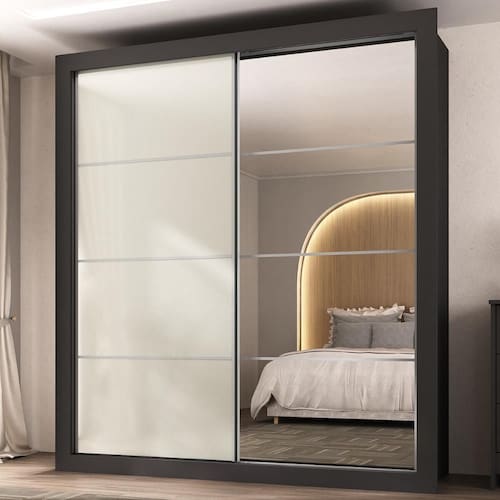 Design e durabilidade: Produzido em MDP (12/15mm) com acabamento acetinado (20% de brilho), este guarda-roupas garante resistência e adiciona um toque de elegância ao seu espaço. Possui 2 portas de correr, sendo 1 delas personalizável, com 1 cor em cada lado, para você escolher a opção que melhor combina com a decoração na hora da montagem. A outra porta, com espelhos de vidro (3mm), amplia o ambiente e oferece uma imagem nítida.