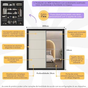 Especificações técnicas: Altura 218cm | Largura 200cm | Profundidade 51cm Material: MDP (12/15mm) Acabamento: Acetinado (cerca de 20% de brilho) Puxadores/Cabideiros: Alumínio Possui Espelhos: Sim Corrediças: Telescópicas