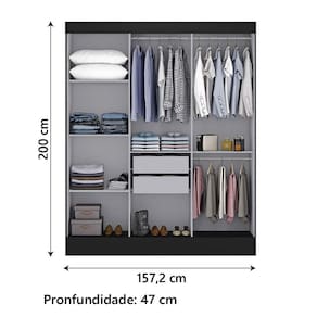 Certifique-se de tudo antes de finalizar a compra, evitando assim futuros desagrados ou imprevistos com a . MEDIDAS:: [ A ] = 200 cm [ L ] = 157,2 cm [ P ] = 47 cm | MEDIDAS ESPELHO:: [ A ] = 50 cm [ L ] = 38,5 cm | PESO:: 95,95 kg | PESO SUPORTADO:: 84 kg | PRATELEIRAS SUPORTAM ATÉ:: 6 kg | GAVETAS SUPORTAM ATÉ:: 3 kg | MODELO:: Guarda Roupas Casal Com Espelho 3 Portas de Correr 2 Gavetas Mônaco | MARCA:: Maxel | ACABAMENTO:: Alto Brilho | MATERIAL:: MDP | ESPESSURA DO MATERIAL:: 12mm | PORTAS:: 3 | TIPO DE PORTA:: Correr | POSSUI ESPELHO:: Sim, 3 Lâminas | CORREDIÇAS:: Metálicas | GAVETAS:: 2 | PRATELEIRAS:: 5 | MATERIAL DOS PUXADORES:: Plástico | CABIDEIROS:: 3 | MATERIAL DOS CABIDEIROS:: Madeira | PÉS:: Não possui | GARANTIA:: 3 Meses | AVISO:: A Esplanada Móveis se responsabiliza pela dos produtos adquiridos até a porta de entrada ou portaria do endereço indicado, se a portaria do condomínio permitir, as s são efetuadas no piso térreo e é de responsabilidade do cliente. | ALTURA:: 200 cm | LARGURA:: 157,2 cm | PROFUNDIDADE:: 47 cm | REQUER MONTAGEM:: Sim | MATERIAIS DA ESTRUTURA:: MDP Cor: Preto