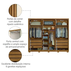 DIFERENCIAL: 3 portas de correr sendo 1 com espelho, 6 gavetas para melhor armazenamento, amplo espaço interno, acabamento fosco, detalhes em ripado autêntico.