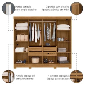 DIFERENCIAL: Portas com detalhes ripados autênticos, amplo espaço de armazenamento, puxadores em MDF, espelhos nas portas centrais