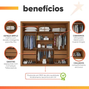 Guarda Roupa Trianon projetado para oferecer beleza e praticidade. Características Principais: Portas de Correr Modernas: 2 portas de correr com batentes e ripados em MDF, garantindo durabilidade e um design elegante. Armazenamento organizado com 4 gavetas (duas de cada lado), todas equipadas com corrediças telescópicas para um deslizar suave e sem esforço, as duas primeiras gavetas vêm com divisões internas, proporcionando uma organização prática e eficiente para seus itens pessoais. Adquira o seu e descubra como a combinação de elegante e eficiência pode transformar seu ambiente!