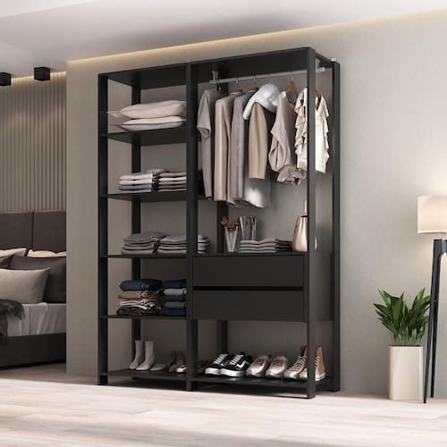 O closet é equipado com 7 prateleiras espaçosas (suportam até 8kg em cada), ideais para acomodar suas roupas e calçados favoritos com estilo e organização inigualáveis. O cabideiro de madeira revestido garante que suas roupas, sejam longas ou curtas, fiquem sempre impecáveis. Além disso, com 2 gavetas que possuem corrediças metálicas, o manuseio dos seus pertences ganha leveza e praticidade. Valorize cada peça do seu vestuário com um design aberto e moderno que realça qualquer espaço.