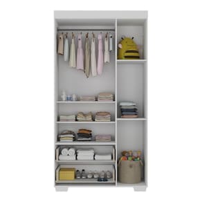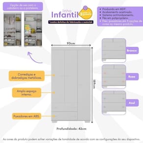 Produzido em MDP (12mm) com acabamento acetinado que oferece cerca de 20% de brilho, o Guarda-Roupas Infantil Flex 3 Portas e 2 Gavetas Algodão Doce Multimóveis MP4245 é sinônimo de resistência e longa vida útil. Suas 3 portas com dobradiças metálicas e 2 gavetas com corrediças metálicas garantem um manuseio suave e seguro, enquanto suas 5 prateleiras internas proporcionam um amplo espaço interno, que facilita a organização das roupas e acessórios da criança. Acompanha 3 opções de cores para os puxadores em ABS, adaptando o móvel ao ambiente, e pés em polipropileno que asseguram uma estabilidade impecável para o móvel, trazendo tranquilidade e segurança para o seu dia a dia. Além disso, conta com um cabideiro de uso opcional, oferecendo ainda mais versatilidade, e sistema antitombamento, que permite maior segurança para a criança. Este guarda-roupas é perfeito para deixar o quarto do seu pequeno organizado e encantador.