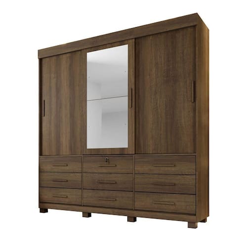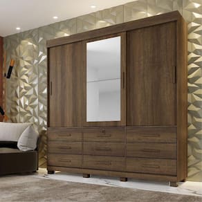 Guarda-roupas Londres 3 Portas 9 Gavetas Com Espelho Benetil Imbuia O Guarda-Roupas Londres com 3 Portas e 9 Gavetas é uma solução elegante e espaçosa para a organização do seu quarto. Com dimensões de 223 cm de altura, 180 cm de largura e 47 cm de profundidade, oferece ampla capacidade de armazenamento. Possui um acabamento em escala de brilho fosco, conferindo um visual moderno e sofisticado. A pintura U.V. aplicada ao guarda-roupas oferece maior durabilidade, resistência a arranhões e facilita a limpeza e manutenção do móvel.
