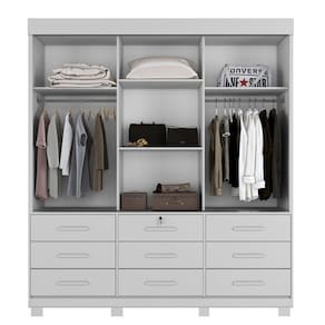 Altura: 223 cm Largura: 180 cm Profundidade: 47 cm Escala de brilho: Fosco Pintura: U.V. (Ultra Violeta) Material: MDP/BP (Medium Density Particleboard/Back Plastic - Placa de Partículas de Média Densidade com Revestimento Plástico) Portas: 3 (de correr) Prateleiras: 4 Gavetas: 9 (incluindo 1 com chave) Corrediças: Telescópicas Pés: 8 pés em PVC, cada um com altura de 6 cm Espelho: 2 espelhos, cada um com medidas de 60 cm x 40 cm Cabideiro: Alumínio