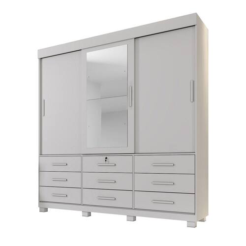 O Guarda-Roupas Londres com 3 Portas e 9 Gavetas é uma solução elegante e espaçosa para a organização do seu quarto. Com dimensões de 223 cm de altura, 180 cm de largura e 47 cm de profundidade, oferece ampla capacidade de armazenamento.Possui um acabamento em escala de brilho fosco, conferindo um visual moderno e sofisticado. A pintura U.V. aplicada ao guarda-roupas oferece maior durabilidade, resistência a arranhões e facilita a limpeza e manutenção do móvel.Construído em MDP/BP, um material de alta qualidade, o guarda-roupas é resistente e robusto. Com 3 portas de correr, oferece um acesso prático e conveniente ao interior do móvel. Além disso, conta com 4 prateleiras que proporcionam espaço para organizar roupas dobradas, calçados e outros itens.O Guarda-Roupas Londres também apresenta 9 gavetas, incluindo 1 gaveta com chave, ideal para armazenar itens pessoais e objetos de valor com segurança. As corrediças telescópicas garantem um deslizamento suave e silencioso das gavetas.Para maior praticidade, o guarda-roupas possui 2 espelhos com medidas de 60 cm x 40 cm cada, permitindo que você se observe e facilite a escolha das roupas. Além disso, conta com um cabideiro em alumínio para pendurar suas roupas e mantê-las organizadas.A estrutura do guarda-roupas é suportada por 8 pés em PVC, com 6 cm de altura cada. Esses pés fornecem estabilidade ao móvel, além de elevá-lo do chão, facilitando a limpeza embaixo do guarda-roupas.Com o Guarda-Roupas Londres, você terá um móvel funcional, espaçoso e esteticamente agradável, que oferece amplo espaço de armazenamento e praticidade no seu quarto.Características Principais:Altura: 223 cmLargura: 180 cmProfundidade: 47 cmEscala de brilho: FoscoPintura: U.V. (Ultra Violeta)Material: MDP/BP (Medium Density Particleboard/Back Plastic - Placa de Partículas de Média Densidade com Revestimento Plástico)Portas: 3 (de correr)Prateleiras: 4Gavetas: 9 (incluindo 1 com chave)Corrediças: TelescópicasPés: 8 pés em PVC, cada um com altura de 6 cmEspelho: 2 espelhos, cada um com medidas de 60 cm x 40 cmCabideiro: Alumínio