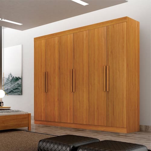 O roupeiro Delta possui 06 portas e duas gavetas na parte interna. Conta com 06 prateleiras muito bem dividas, 02 cabideiros e 01 calceiro facilitando muito a organização no dia a dia.