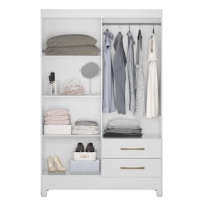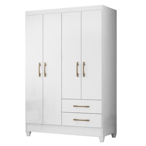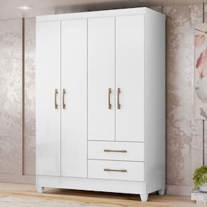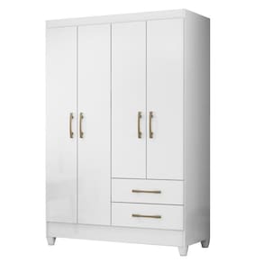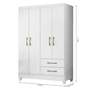 Características Estrutura em MDP de 12mm. Pintura em acabamento UV. 04 Portas articuladas com dobradiças metálicas. 02 Gavetas externas com corrediças metálicas. Cabideiros em madeira. Amplo espaço interno com prateleiras. Puxadores na cor bronze. Pés em PVC.