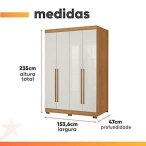 Importante sobre a : A é realizada até a portaria ou porta de entrada do indicado, desde que o acesso seja permitido. Para locais com portaria, a será feita no piso térreo. Não realizamos montagem, desmontagem, por escadas ou içamento. É responsabilidade do cliente verificar se as dimensões do produto são compatíveis com portas, elevadores e corredores. Evite imprevistos: confira todos os detalhes antes de concluir sua compra. MEDIDAS:: A = 235 cm L = 153,6 cm P = 47 cm | MEDIDAS PÉS:: A = 5 cm L = 10 cm P = 4 cm | PESO:: 104,7 kg | PESO SUPORTADO:: 60 kg | PRATELEIRAS SUPORTAM ATÉ:: 5 kg | GAVETAS SUPORTAM ATÉ:: 5 kg | CABIDEIROS SUPORTAM ATÉ:: 7 kg | MODELO:: Guarda Roupas Solteiro Com 4 Portas 2 Gavetas Creta | MARCA:: Aramóveis | PINTURA:: UV de alta qualidade | ACABAMENTO:: Verniz Brilho | MATERIAL DA ESTRUTURA:: MDP | PORTAS:: 4 | TIPO DE PORTA:: Bater | DOBRADIÇAS:: Metálicas | GAVETAS:: 2 | CORREDIÇAS:: Telescópicas | PRATELEIRAS:: 6 espaçosas | MATERIAL DO CABIDEIRO:: Alumínio | PUXADORES:: 4 | MATERIAL DOS PUXADORES:: MDF | QUANTIDADE DE PÉS:: 6 | MATERIAL DOS PÉS:: Plástico | DIFERENCIAL:: Puxadores em MDF resistentes / Corrediças telescópicas metálicas / Pintura UV de alta qualidade / Amplas prateleiras / Cabideiros em alumínio oblongos | INSTRUÇÕES E CUIDADOS:: Para maior durabilidade, recomendável que a limpeza dos móveis seja feita com pano limpo e seco. Não usar produtos químicos ou abrasivos. | GARANTIA:: 3 meses. | AVISO:: Importante sobre a : A é realizada até a portaria ou porta de entrada do indicado, desde que o acesso seja permitido. Para locais com portaria, a será feita no piso térreo. | Altura: 235 | Inclui manual de montagem: Sim | Largura: 153,6 | Profundidade: 47 | Requer montagem: Sim | Cor: Madeirado/Off White