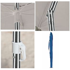Possui saída de ar no topo que auxilia na estabilidade e sua haste em alumínio vem com tem alavanca e duplo pino de fixação, o que garante maior segurança evitando que a parte superior do guarda-sol se solte. O guarda-sol é articulável, permitindo que você ajuste a posição como preferir.