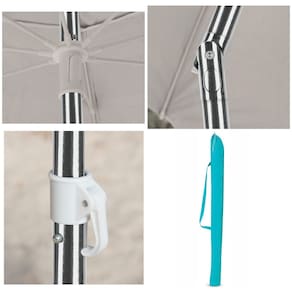 Possui saída de ar no topo que auxilia na estabilidade e sua haste em alumínio vem com tem alavanca e duplo pino de fixação, o que garante maior segurança evitando que a parte superior do guarda-sol se solte. O guarda-sol é articulável, permitindo que você ajuste a posição como preferir.