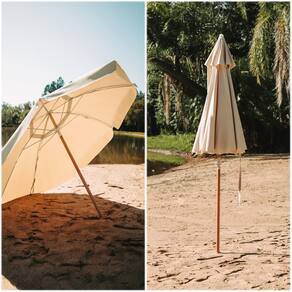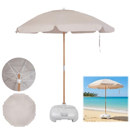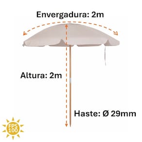 Guarda sol: Material: Madeira Cor Predominante: Bege Medidas e peso: Base plástica: Material: Polipropileno Capacidade: 18l de água ou 22kg de areia Medidas guarda sol: (Envergadura) 2,00m x (Alt.) 2,02m Haste: Ø 28mm Peso: 2,15 kg