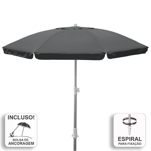 Acompanha Kit de Fixação/Ancoragem. Reforçado e com design diferenciado, chama atenção por sua elegância. Projetado com uma estrutura em alumínio reforçado e varetas em fibra de vidro que garantem resistência aos efeitos da corrosão. As 8 varetas em fibra de vidro com espessura de 7.9 mm garantem robustez ao produto. Possui saída de ar no topo que auxilia na estabilidade e sua haste em alumínio vem com sistema de fixação em espiral. Sua cobertura com fator de proteção solar UV 50+ é feita com tecido em poliéster com camada de silver coating. Acompanha bolsa de transporte. Prático, resistente, bonito e leve.
