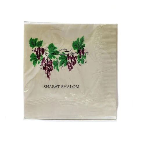 Pacote com 50 unidades de guardanapos desenhados com temas de shabat, decorados com uvas e com as palavras shabat shalom, transliterada.