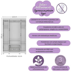 Dimensões do Produto Montado: Altura: 189cm | Largura: 122cm | Profundidade: 41cm Altura dos Pés: 5,8cm *Você pode consultar as medidas detalhadas na imagem técnica do produto.