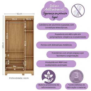 Dimensões do Produto Montado: Altura: 189cm | Largura: 92cm | Profundidade: 41cm Altura dos Pés: 5,8cm *Você pode consultar as medidas detalhadas na imagem técnica do produto.
