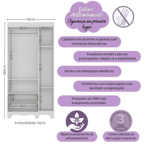 Dimensões do Produto Montado: Altura: 189cm | Largura: 92cm | Profundidade: 41cm Altura dos Pés: 5,8cm *Você pode consultar as medidas detalhadas na imagem técnica do produto.