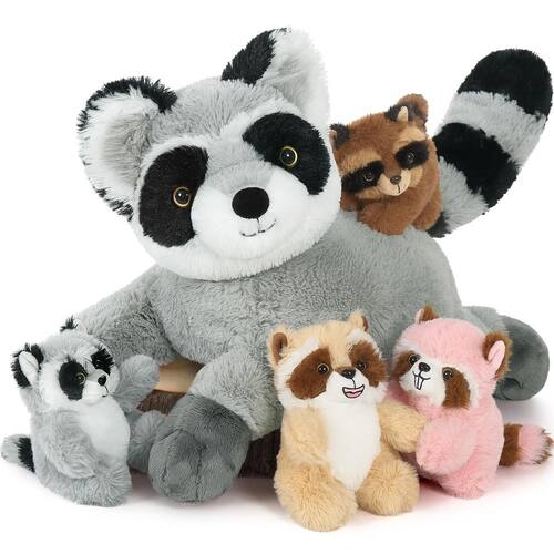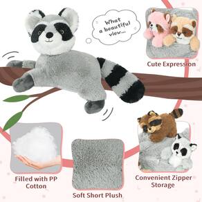 Raccoon Stuffed Animal - Conjunto de brinquedos de pelúcia guaxinim: há 4 bebês fofos guaxinim na barriga da mamãe, basta abrir o zíper e você descobrirá a surpresa! Meninos e meninas vão adorar o design exclusivo e mal podem esperar para brincar com eles. - Material confiável: o pelúcia de guaxinim de pelúcia é feito de tecido de pelúcia curto, preenchido com algodão pp, que é macio e não irrita a pele ao toque. Sem cheiro, não desbota, muito adequado para abraçar e brincar. - Brinquedo divertido e educativo: o bicho de pelúcia guaxinim tem aparência realista, as crianças podem aprender mais sobre o animal guaxinim. Eles podem jogar, contar histórias com amigos, o que é criativo e interessante, ao mesmo tempo em que melhora a interação, melhorando a imaginação e a capacidade das mãos. - Multifuncional e presentes: este conjunto de brinquedos de guaxinim de pelúcia gigante não é apenas um ótimo brinquedo decorativo para cama, sofá, cadeira, mesa ou sofá, mas também um bom travesseiro para dormir. Os adultos podem liberar o desconforto ao abraçar o travesseiro macio. Também é um companheiro de brincadeira quente para acompanhar as crianças crescendo. Basta dar o doce presente para seus entes queridos no Natal, Halloween, Dia dos Namorados, Dia das Crianças, Páscoa, Ação de Graças, Ano Novo ou aniversário. - ?Dicas?: Devido às necessidades de transporte, os brinquedos de pelúcia serão embalados em uma bolsa compactada. Depois de abrir o pacote, você pode dar um tapinha suave ou soprar a superfície de pelúcia com ar quente de um secador de cabelo, eles serão restaurados à forma autêntico em breve.
