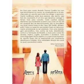 Em Guia para casais, Rodolfo Thomaz Castilho faz com que encontremos as causas, as consequências e as soluções para um assunto que muito nos atinge: o relacionamento conflituoso entre duas pessoas, seja dentro, seja fora do casamento. É um livro que devemos carregar o tempo todo para consulta. Cada capítulo explora elementos que facilmente ocorrem com cada um de nós em qualquer tipo de relacionamento. São as armadilhas nas quais caímos todos os dias. Sexo, DR, família, dinheiro, enfim, todos os aspectos que podem fazer um relacionamento amadurecer ou ser sabotado. Com uma abordagem psicanalítica, mas, acima de tudo, diversificada, como é a formação de Rodolfo, o Guia para casais tira dúvidas, explica, sugere, aconselha e esclarece. Tudo numa linguagem fácil e objetiva, e o que é mais importante: aponta quem são os responsáveis por casamentos desastrosos e infelizes. Uma verdadeira terapia de casais na qual o paciente é o leitor. Gino Cammarota Psicanalista Marca: ARTERA EDITORA