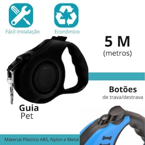 5 metros de guia para mais liberdade Segurança e controle durante o passeio Suporta até 20kg Produzido com material de qualidade Trava de segurança