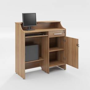 Gaveta com corrediças metálicas, chave e porta cédulas; abaixo porta objeto com prateleira; pés com niveladores de altura.