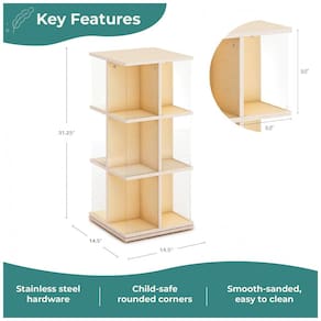A estante giratória infantil Guidecraft EdQ Kids Rotating Bookshelf é uma torre de livros de chão em madeira de bétula natural, projetada para uso em quartos infantis, salas de aula e brinquedotecas. A base giratória em 360° com três níveis de prateleiras permite que as crianças acessem livros e objetos de todos os lados, facilitando a organização e o uso autônomo.?