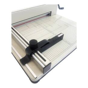 Feita em aço; Capacidade de corte: até 400 folhas; Tipo: a3; Faca com mola e prensa travável; Faca com trava automática; Pés emborrachados; Esquadro perfeito: possui um esquadro fixo e um móvel, que deve ser ajustado no tamanho do corte; Prensagem do papel através de uma manivela rotatória, permitindo agilidade e eficiência no processo; Comprimento do corte: 43cm; Largura da guilhotina: 54cm; Profundidade da guilhotina: 66cm.