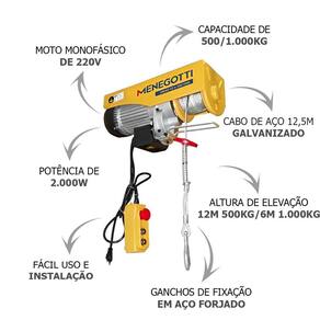 Fabricado com tecnologia de ponta pela Menegotti, o equipamento garante durabilidade e alta performance, além de ser compacto e fácil de manusear. Sua estrutura robusta e componentes de alta qualidade, como cabo de aço galvanizado e sistema de freio eficiente, garantem estabilidade e proteção durante o uso. Com motor de 2000W e sistema monofásico de 220V, é uma excelente solução para quem busca eficiência com um ótimo custo-benefício.