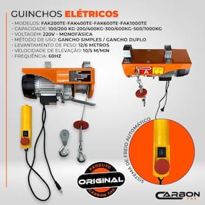 Talha guincho elétrico 500 a 1000 kg 12 metros de elevação 220v fak1000te - carbon fak Equipamento versátil, prático e extremamente útil para a elevação de cargas em regimes de trabalho intermitente Possui configuração compacta e de fácil operação, além disso, é alternativa de baixo custo de aquisição e manutenção, ideal para aplicações em oficinas, estabelecimentos comerciais e indústrias. - dupla capacidade de carga, por engate rápido - sistema de freio automático - fim de curso para levantamento máximo - cabo elétrico com plug conforme abnt nbr 14136 - baixo índice de ruído - compacto e de simples manutenção Aplicações - elevação de cargas em regime de trabalho intermitente - ideal para aplicações em oficinas, indústrias e estabelecimentos comerciais Especificações técnicas Marca - carbon fak Modelo - fak1000te Voltagem - 220v monofásica Potência - 1850w Método de uso - gancho simples / gancho duplo Altura de elevação - 12 metros com gancho simples e 6 metros com gancho duplo Velocidade de elevação - 10/ 5m/min Comprimento do cabo de aço - 12 metros Frequência - 60hz Grau de proteção da botoeira - ip65 Grau de proteção do motor - ip55 Peso líquido - 25kg de 6 meses Este equipamento deve ser utilizado apenas por profissionais Marca: Não Informado