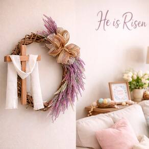 Leve fé, beleza e significado para sua decoração de Páscoa com esta linda guirlanda em formato de cruz, adornada com flores delicadas. Ideal para portas, paredes ou ambientes religiosos, ela transmite paz, espiritualidade e o verdadeiro sentido da Páscoa