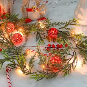 Guirlanda de Natal CCINEE de 6 pés com luzes Guirlanda de Natal artificial pré-iluminada com 20 LED Guirlanda de abeto iluminada operada por bateria com bola de Natal vermelha para árvore de Natal, decoração de parede doméstica, suprimentos de festa - Decoração de guirlanda de Natal: você receberá 1 pacote de guirlanda de Natal artificial de 6 pés com 20 luzes LED, incluindo 5 peças de luzes vermelhas de bolas de Natal. A guirlanda de Natal pré-iluminada mede 1,8 m de comprimento, é adequada para qualquer lugar da sua casa e os torna mais bonitos. Traga uma atmosfera de Natal mais calorosa. - Alta qualidade: A guirlanda artificial é feita de material premium, durável e resistente, impermeável e flexível, pode ser torcida e moldada como você projetou. Além disso, a guirlanda de vegetação é reutilizável e fácil de armazenar. Ao mesmo tempo, a guirlanda de Natal também pode adicionar mais elementos de Natal gratuitamente para decorar sua casa. Decorações internas e externas perfeitas para a festa de Natal. - Design realista: as guirlandas de vegetação de Natal são elaboradamente elaboradas com textura realista, o que as torna mais realistas e atraentes. E o cordão de luz da guirlanda é decorado com uma bola de Natal LED. Cores vibrantes, assim como uma guirlanda de pinho decorada com grandes frutas vermelhas. Delicado e requintado. Perfeito para mantos, lareira, porta da frente, escadas, varanda, cerca, casa de fazenda, mesa de jantar e muito mais. - Função de temporizador operada por bateria: A decoração da guirlanda de Natal é envolta em 20 luzes LED(15 LED e 5 bolas de LED)operadas por 3 pilhas AA (não incluídas) para proporcionar um brilho duradouro. Interruptor: ligado/temporizador/desligado. Com o temporizador ligado, ele pode acender por 6 horas e desligar automaticamente por 18 horas. Conveniente de usar e fácil de operar, você não precisa se preocupar com os fios e onde conectá-los. - Ampla aplicação: as guirlandas de Natal pré-iluminadas podem ser decoradas em lugares diferentes, perfeitas para mantos, mesas de jantar, lustres, enfeites de portas dianteiras, escadarias, árvores de Natal, janelas, jardim, etc.