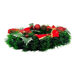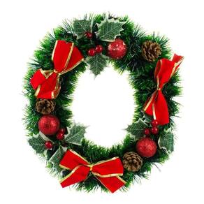 Enfeite decorativo natalino composto por uma guirlanda de 31 cm de diâmetro decorado com laços, pinha, cerejas e bola natalina. Material: plástico