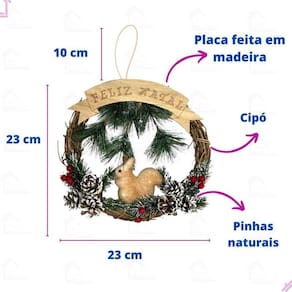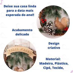 O natal é tempo de celebrar o amor, comemorar a vida com novas esperanças, novos sonhos e também é a hora de deixar a casa mais bonita para receber a família nesta data tão importante. Feita com materiais de qualidade, esta guirlanda de natal, trará todo um charme que irá contagiar seu ambiente, o item perfeito para decorar sua casa e aguardar a chegada do bom velhinho. Esta guirlanda é confeccionada com materiais de qualidade, possui um lindo design contendo um esquilo, placa de feliz natal em madeira, detalhes em festão verde, pinhas naturais e decoração de pequenas cerejas, que deixarão sua decoração rica em detalhes. Tamanho ideal, sendo 23 cm e você poderá usar tanto na decoração da sua casa quanto de sua empresa.