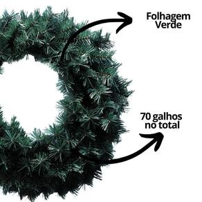 Deixe sua decoração natalina ainda mais sofisticada com a guirlanda verde, desenvolvida para oferecer volume e enchimento completo. Composta por 70 galhos de PVC de alta qualidade e estrutura reforçada em metal, ela possui 45cm de diâmetro, ideal para dar destaque em portas de entrada, paredes ou até mesmo como centro de arranjos festivos.