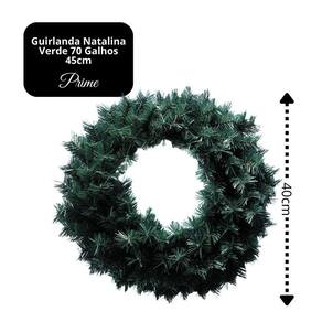 Deixe sua decoração natalina ainda mais sofisticada com a guirlanda verde, desenvolvida para oferecer volume e enchimento completo. Composta por 70 galhos de PVC de alta qualidade e estrutura reforçada em metal, ela possui 45cm de diâmetro, ideal para dar destaque em portas de entrada, paredes ou até mesmo como centro de arranjos festivos.