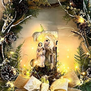 A nossa Guirlanda Natalina Sino Sagrada Família é um item exclusivo desenvolvido por nossos designers e arquitetos para deixar o seu ambiente ainda mais sofisticado neste Natal. Com aproximadamente 75,0cm de altura, 60,0cm de largura e 18,0cm de profundidade, essa guirlanda conta com a sagrada família em resina e um fio de led, proporcionando um efeito luminoso encantador.