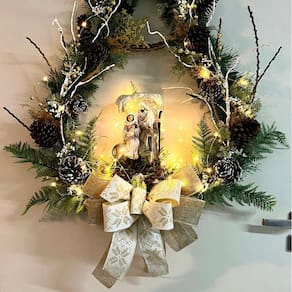 Material: enfeites naturais, plástico e arame, fio de led, sagrada família em resina.