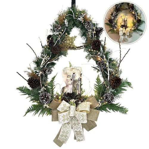 A nossa Guirlanda Natalina Sino Sagrada Família é um item exclusivo desenvolvido por nossos designers e arquitetos para deixar o seu ambiente ainda mais sofisticado neste Natal. Com aproximadamente 75,0cm de altura, 60,0cm de largura e 18,0cm de profundidade, essa guirlanda conta com a sagrada família em resina e um fio de led, proporcionando um efeito luminoso encantador.