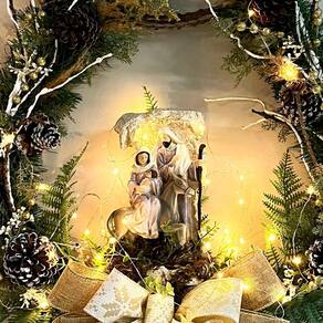 Material: enfeites naturais, plástico e arame, fio de led, sagrada família em resina.