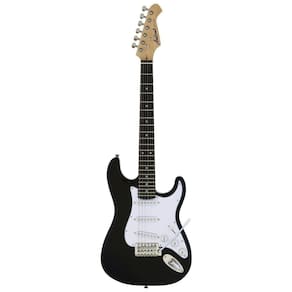 Guitarra Aria Stg-mini Black A Guitarra Aria STG-Mini é um modelo de brilhar os olhos, ideal para guitarristas que buscam um instrumento compacto e cheio de atitude. Disponível em diversas cores, a Aria Série STG-Mini é uma opção poderosa para guitarristas de todos os níveis, atendendo desde quem está começando até os mais experientes. O tamanho muda, mas a potência sonora permanece. Com seus três captadores de bobina Aria OS-1 ela garante o som estonteante, perfeito para quem busca um timbre mais agressivo. A Aria STG-Mini foi projetado para proporcionar muito som, no estilo clássico 100% rock\'n roll. Ponte:VFT-1 Tremolo Cor:Black Corpo:Basswood Braço:Maple, Bolt-on Escala:Rosewood Comprimento da escala:580mm (22-7/8) Raio da escala: 240R (mm) Raio da escala: 9.5 (polegadas)